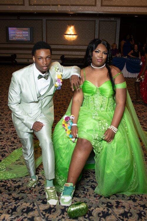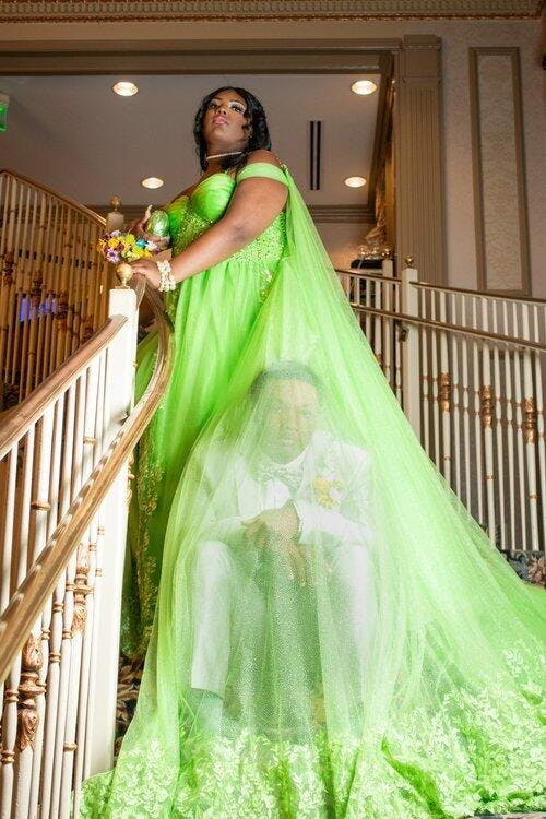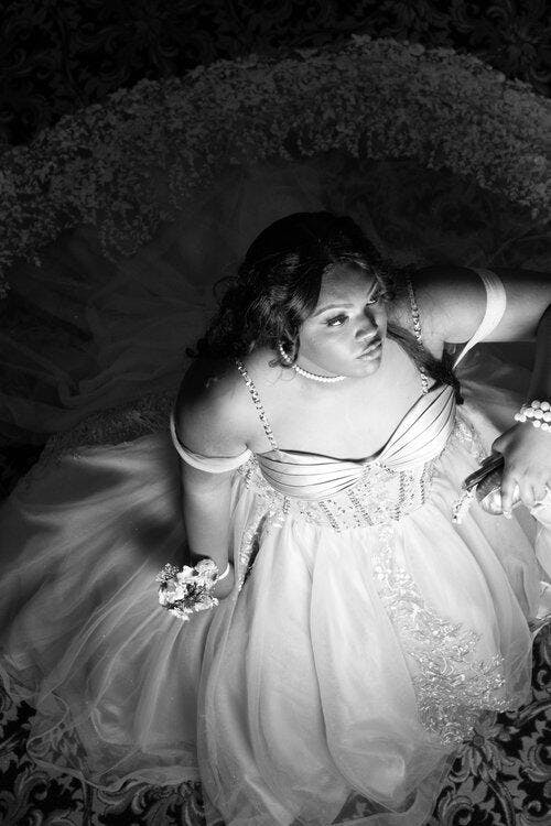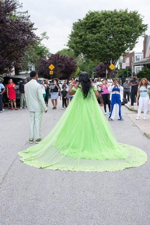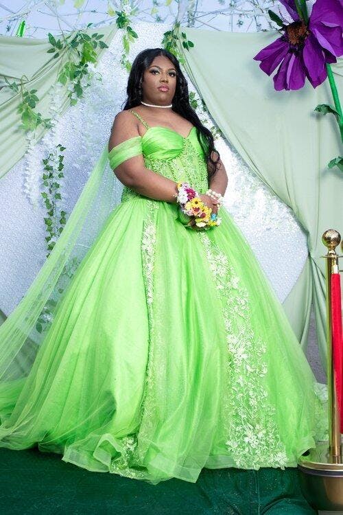 • Merkmale des Quinceanera-Kleides: Langes Ballkleid mit Blumenapplikationen und trägerlosem Korsett, verziert mit metallischen Stickereien und Kristallperlen; der volle Glitzertüllrock wurde passend dazu akzentuiert und verfügt über eine geformte Überlage und eine Kathedralenschleppe.