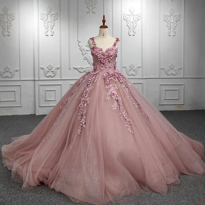 Rosa Blumen Applikationen Spitze Quinceanera Kleider Ballkleid Glitzernder Tüll Off Shoulder Ballkleider Sweet 15 16 Kleider für Damen