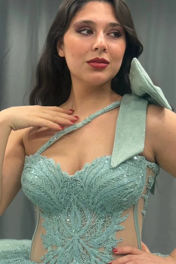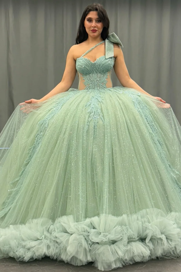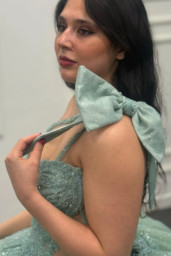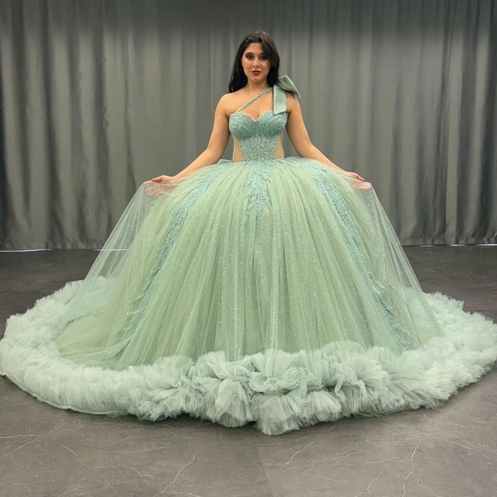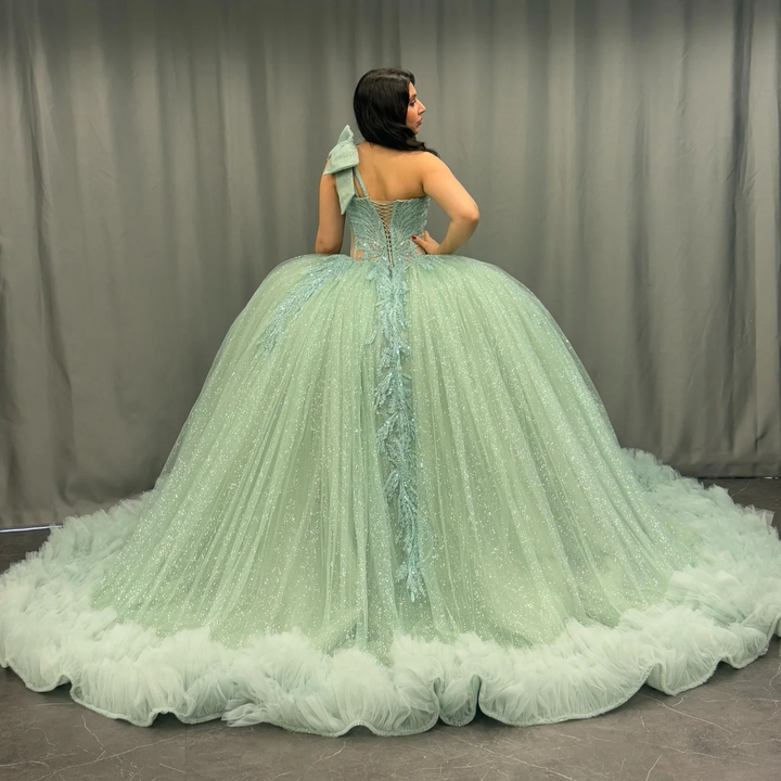• Merkmale des Quinceanera-Kleides: Langes Ballkleid mit Blumenapplikationen und trägerlosem Korsett, verziert mit metallischen Stickereien und Kristallperlen; der volle Glitzertüllrock wurde passend dazu akzentuiert und verfügt über eine geformte Überlage und eine Kathedralenschleppe.