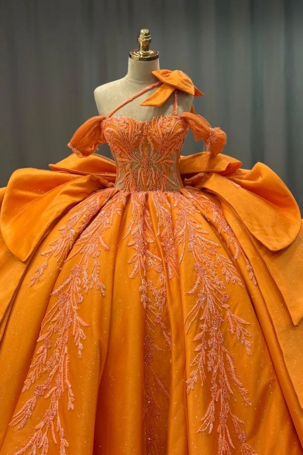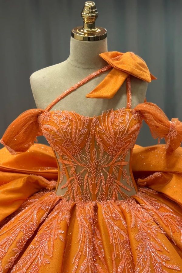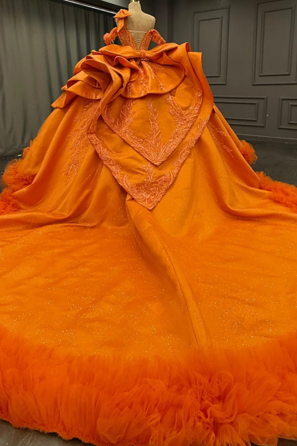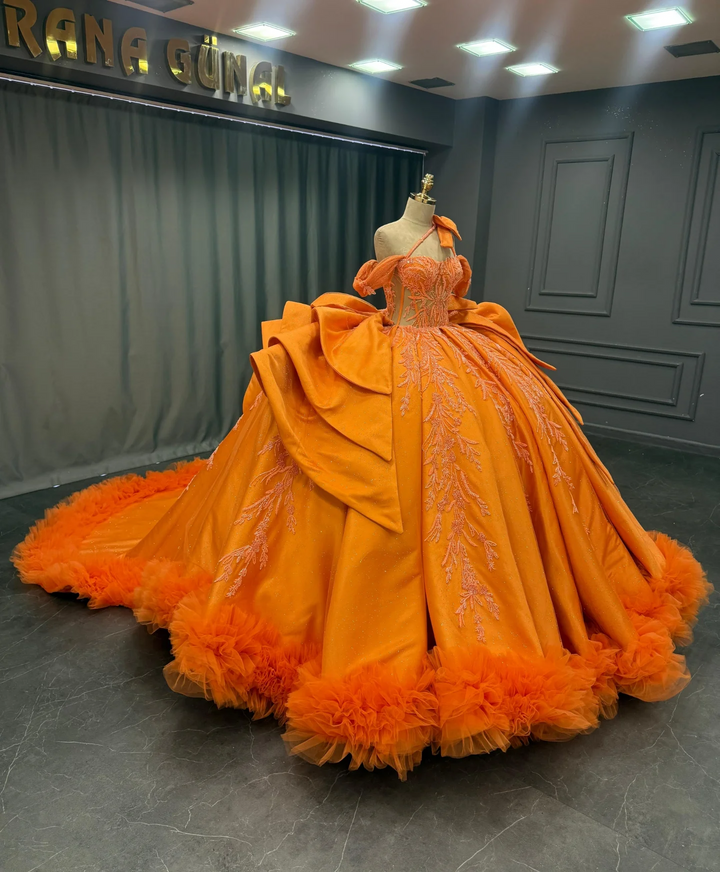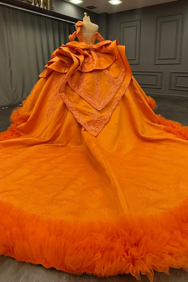 • Merkmale des Quinceanera-Kleides: Langes Ballkleid mit Blumenapplikationen und trägerlosem Korsett, verziert mit metallischen Stickereien und Kristallperlen; der volle Glitzertüllrock wurde passend dazu akzentuiert und verfügt über eine geformte Überlage und eine Kathedralenschleppe.