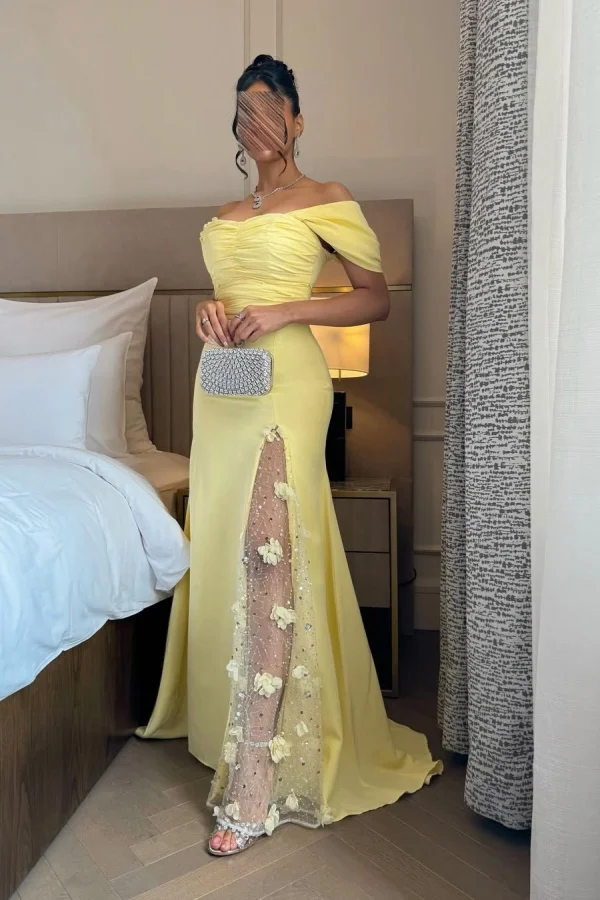 WU1060 - Modernes und schickes schulterfreies Etuikleid mit langen Tüllärmeln, bodenlangem Ball- und Partykleid, 3D-Blumen, Pailletten, gelber Tüll, formelles Abendkleid, Hochzeitsgastkleid