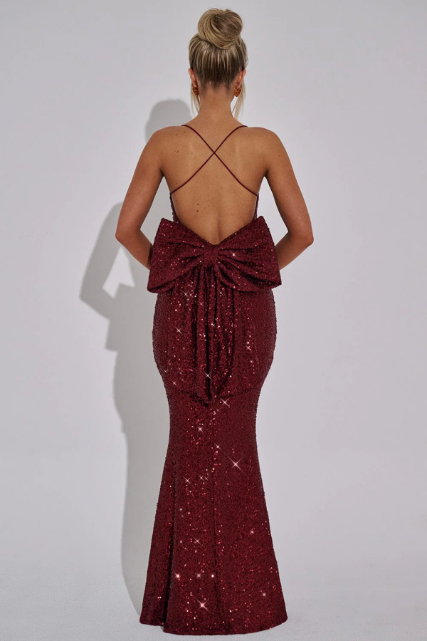 WU1068 - Sexy & heißes Meerjungfrauen-Abendkleid mit eckigen Spaghettiträgern, ärmellos, offenem Rücken, bodenlanges Ballkleid, komplett mit Pailletten besetzt, Kleid für besondere Anlässe, Abendkleid, Partykleid mit Schleife