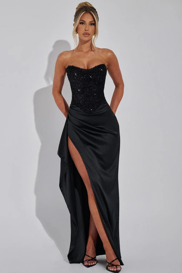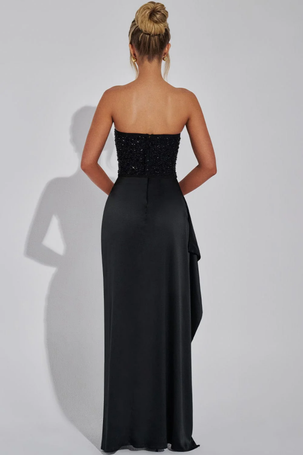Dieses klassische und schlichte Etuikleid hat ein trägerloses, ärmelloses Design mit Faltendetails und Perlenpailletten. Der hohe Seitenschlitz und das bodenlange Design machen es für formelle Anlässe und Abendveranstaltungen geeignet. Fallen Sie in diesem zeitlosen und eleganten Kleid auf.