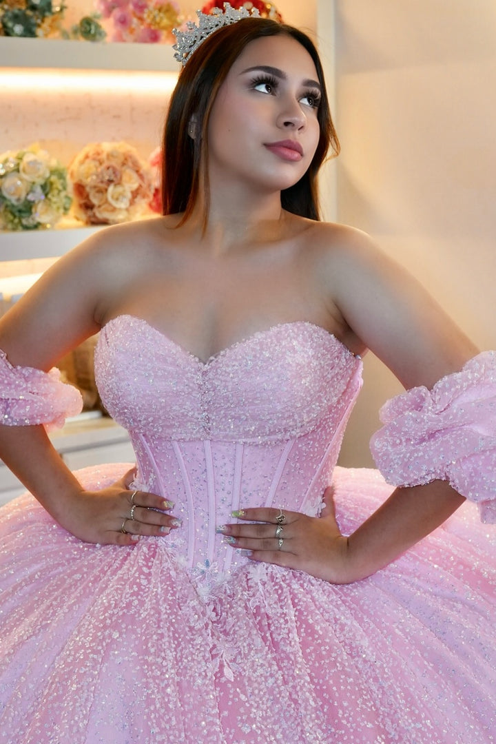 Langes Quinceanera-Kleid mit Herzausschnitt für Damen, trägerloses Korsett mit Blumenapplikationen, Perlenbesetztes Tüll-Ballkleid