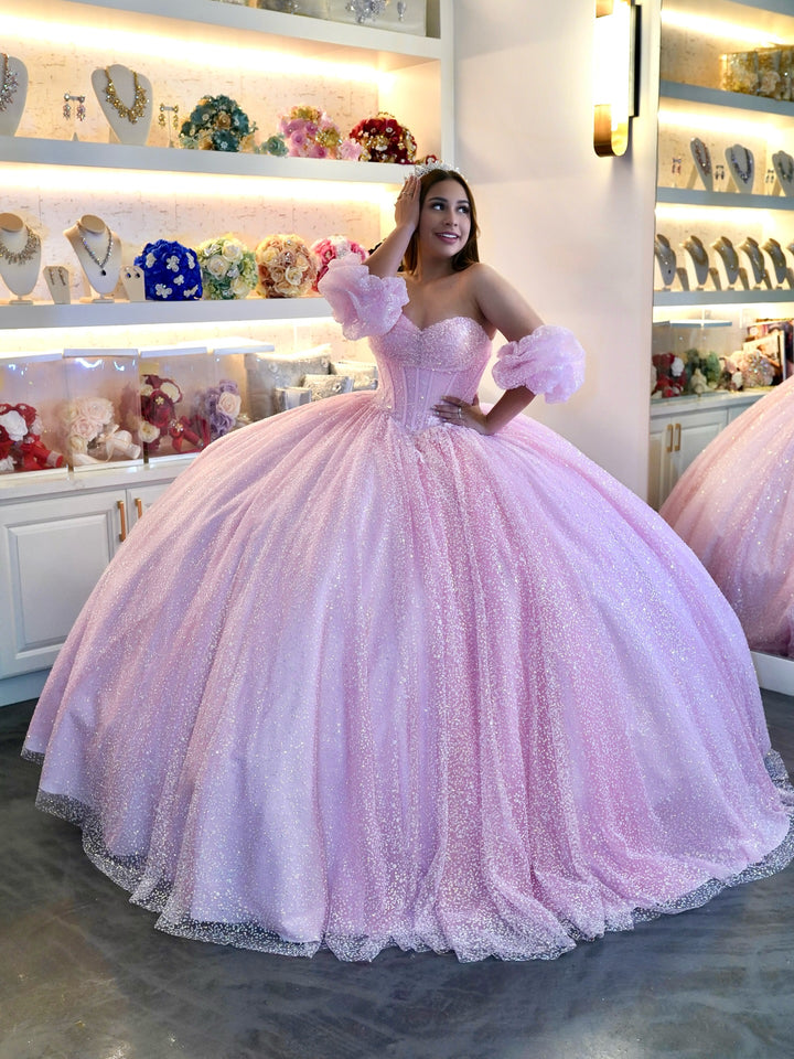 • Merkmale des Quinceanera-Kleides: Langes Ballkleid mit Blumenapplikationen und trägerlosem Korsett, verziert mit metallischen Stickereien und Kristallperlen; der volle Glitzertüllrock wurde passend dazu akzentuiert und verfügt über eine geformte Überlage und eine Kathedralenschleppe.