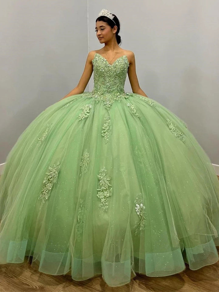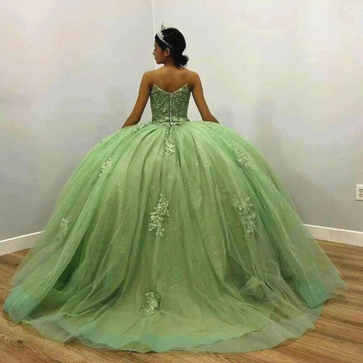Salbeigrünes Ballkleid Quinceanera-Kleid mit herzförmigem Ausschnitt, Spitzenapplikationen, 3D-Blumen, Perlenbesatz, Tüll, Prinzessin, Sweet 16, Geburtstagspartykleid 2024