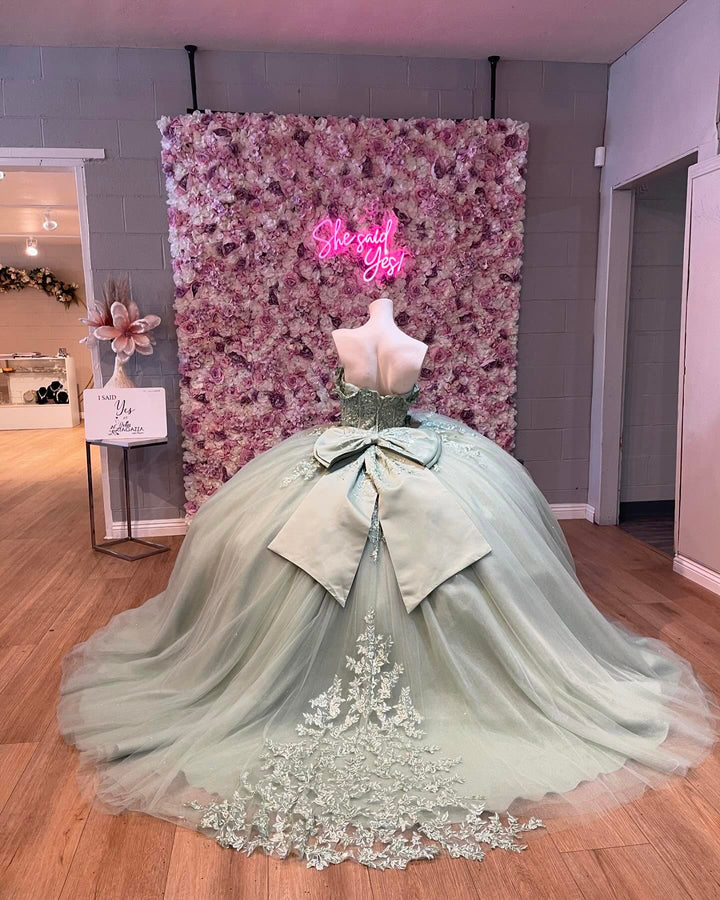 • Merkmale des Quinceanera-Kleides: Langes Ballkleid mit Blumenapplikationen und trägerlosem Korsett, verziert mit metallischen Stickereien und Kristallperlen; der volle Glitzertüllrock wurde passend dazu akzentuiert und verfügt über eine geformte Überlage und eine Kathedralenschleppe.