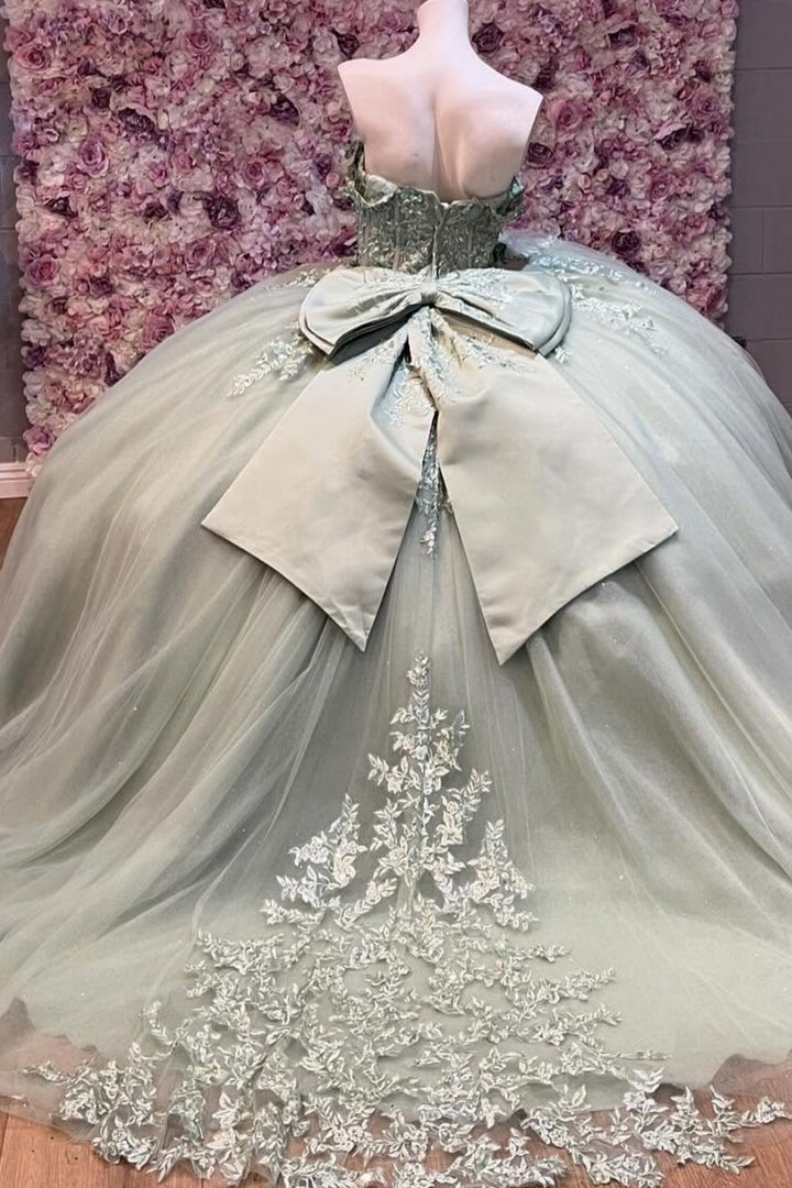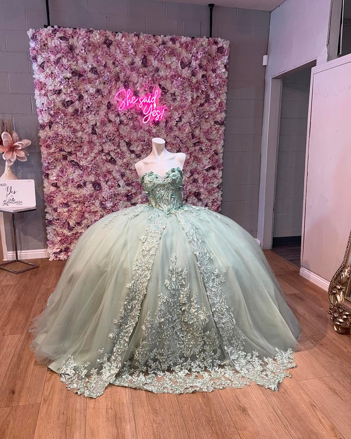Langes Quinceanera-Kleid mit Herzausschnitt für Damen, trägerloses Korsett mit Blumenapplikationen, Perlenbesetztes Tüll-Ballkleid