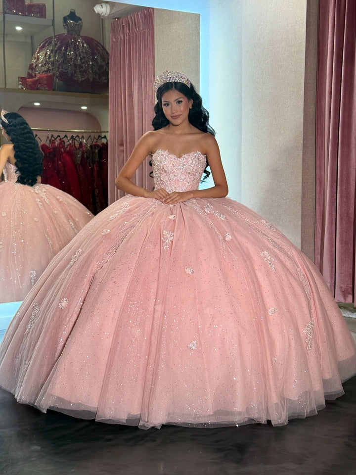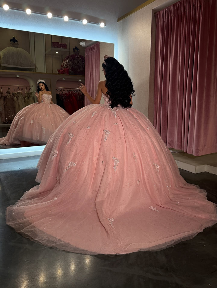 • Merkmale des Quinceanera-Kleides: Langes Ballkleid mit Blumenapplikationen und trägerlosem Korsett, verziert mit metallischen Stickereien und Kristallperlen; der volle Glitzertüllrock wurde passend dazu akzentuiert und verfügt über eine geformte Überlage und eine Kathedralenschleppe.
