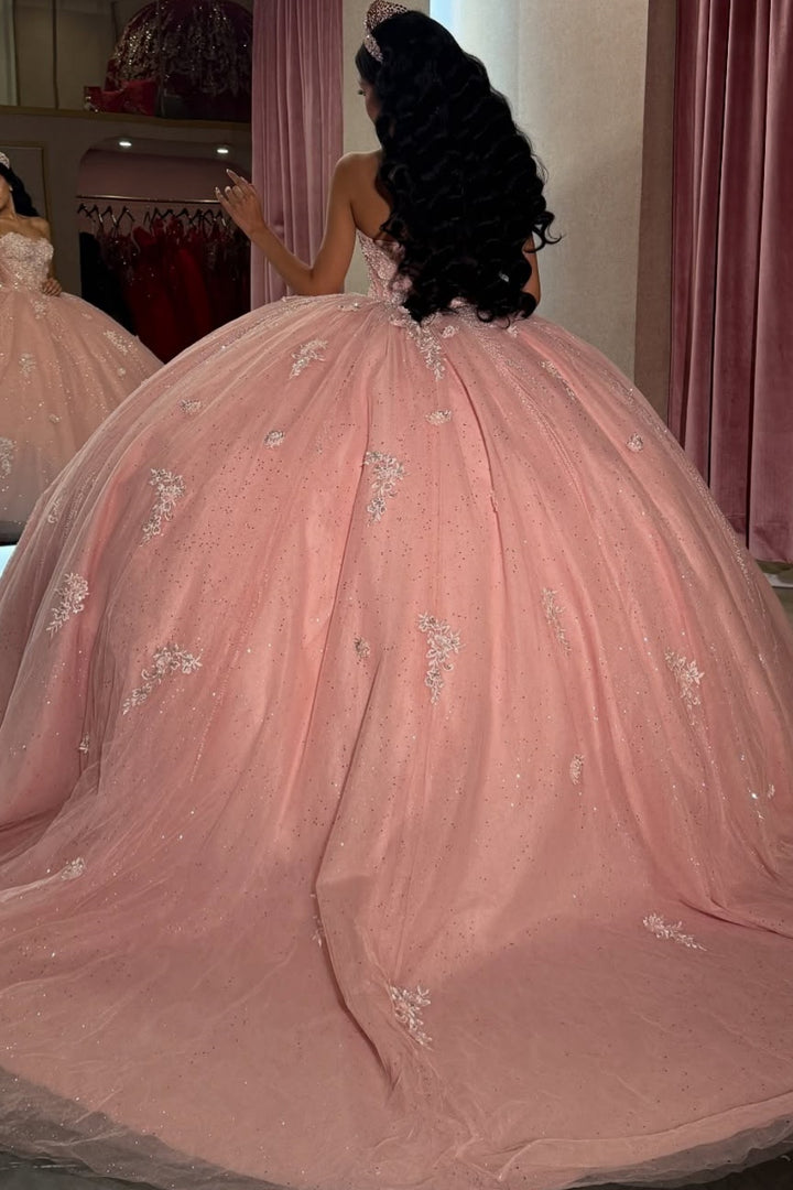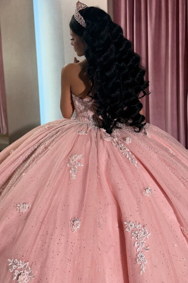 Langes Quinceanera-Kleid mit Herzausschnitt für Damen, trägerloses Korsett mit Blumenapplikationen, Perlenbesetztes Tüll-Ballkleid