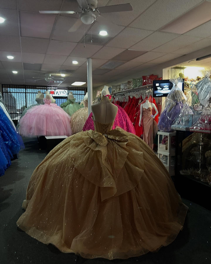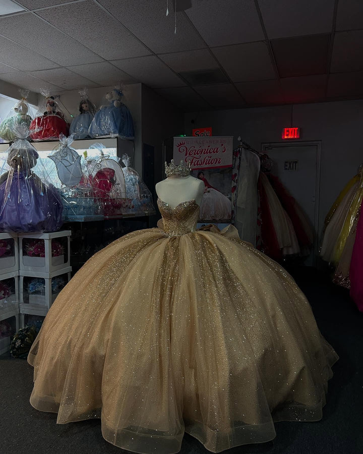 • Merkmale des Quinceanera-Kleides: Langes Ballkleid mit Blumenapplikationen und trägerlosem Korsett, verziert mit metallischen Stickereien und Kristallperlen; der volle Glitzertüllrock wurde passend dazu akzentuiert und verfügt über eine geformte Überlage und eine Kathedralenschleppe.