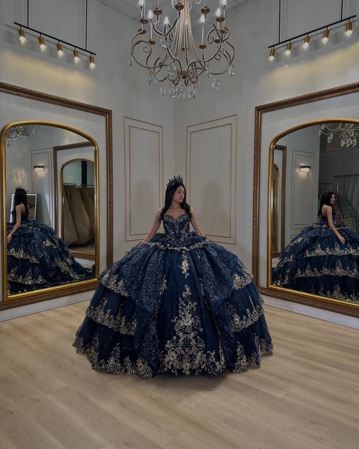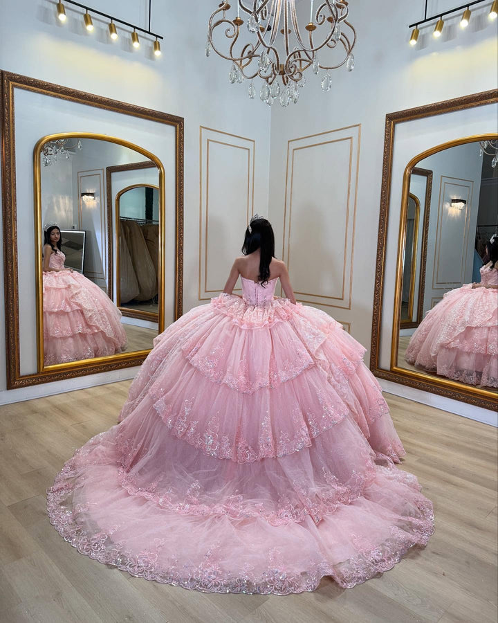 • Merkmale des Quinceanera-Kleides: Langes Ballkleid mit Blumenapplikationen und trägerlosem Korsett, verziert mit metallischen Stickereien und Kristallperlen; der volle Glitzertüllrock wurde passend dazu akzentuiert und verfügt über eine geformte Überlage und eine Kathedralenschleppe.