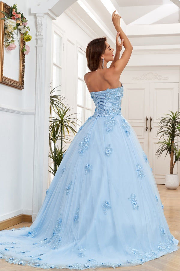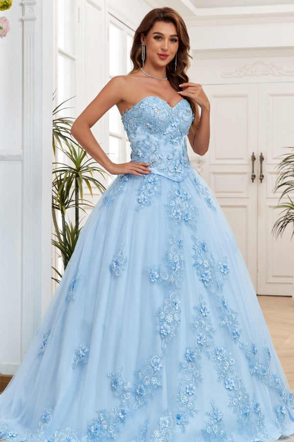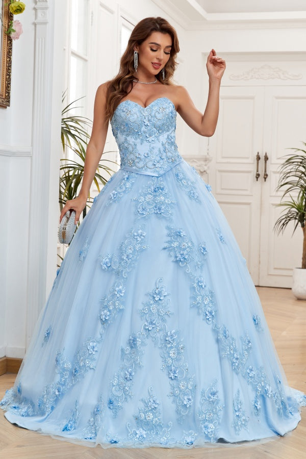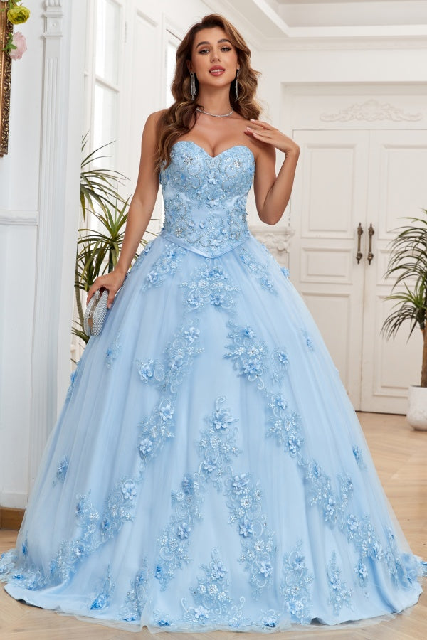 Langes Quinceanera-Kleid mit Herzausschnitt für Damen, trägerloses Korsett mit Blumenapplikationen, Perlenbesetztes Tüll-Ballkleid