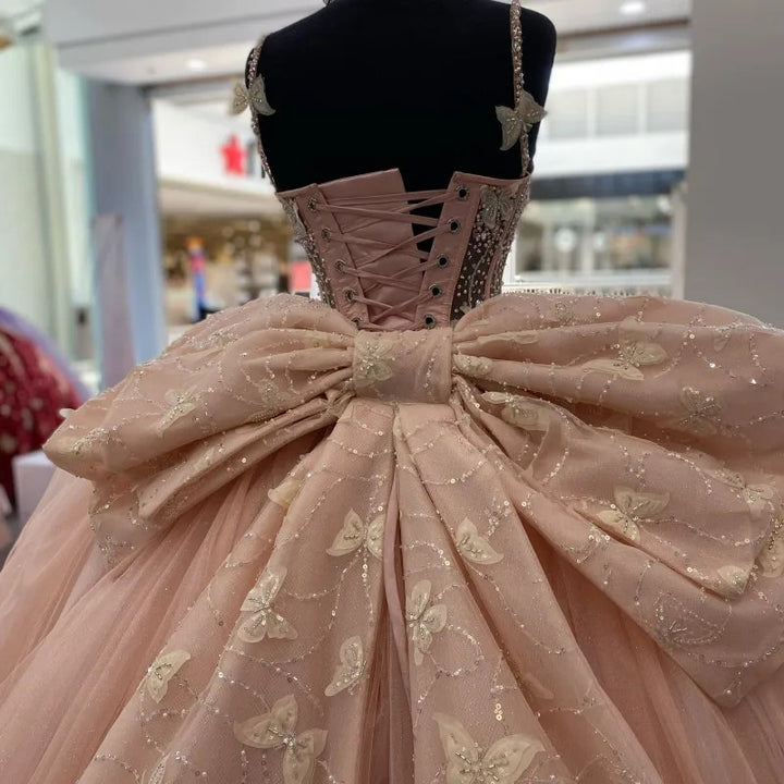 Rosa Sweetheart Glänzendes Korsett Ballkleid Spaghettiträger Prinzessin Abendkleider Schmetterling Große Schleife Perlen Sweet 16 Quinceanera Kleider Abschlussball Partykleider