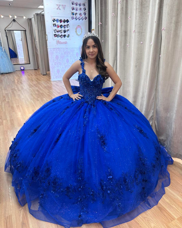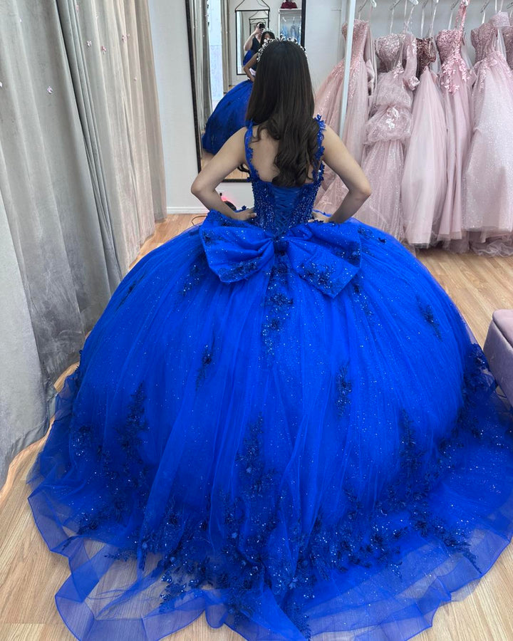 Description: This royal blue ball gown features a sweetheart neckline with delicate straps and a sleeveless design, enhanced by intricate beaded appliques. The charming bow knot detail adds a touch of elegance, while the tulle fabric provides volume and movement. Perfect for a quinceanera or birthday celebration, this dress offers a refined, princess-worthy silhouette.
