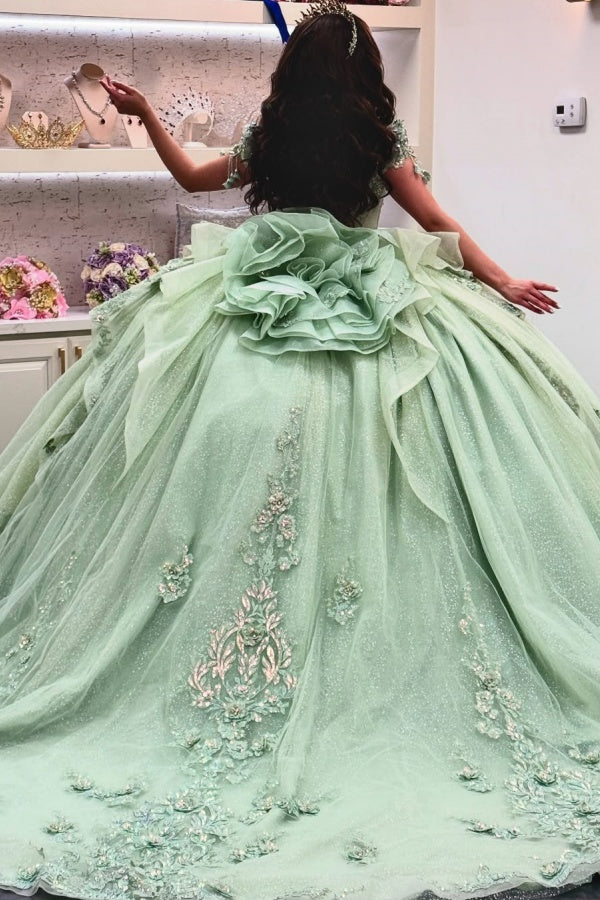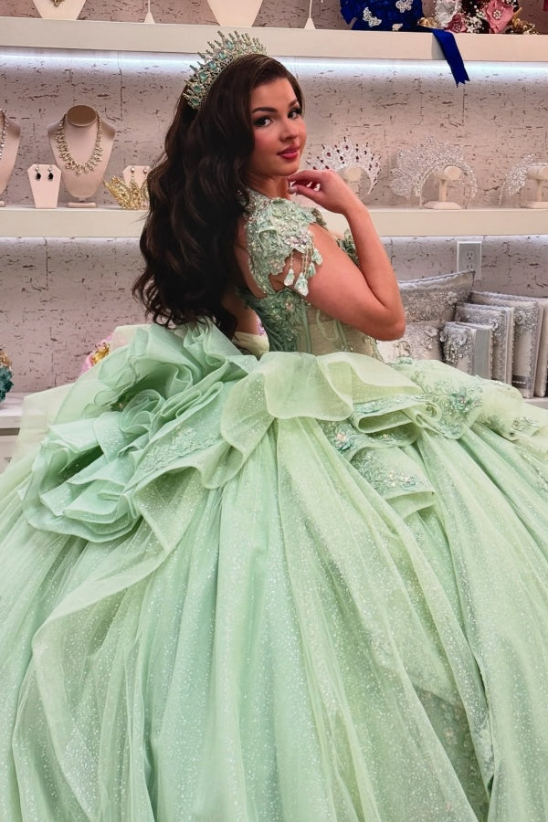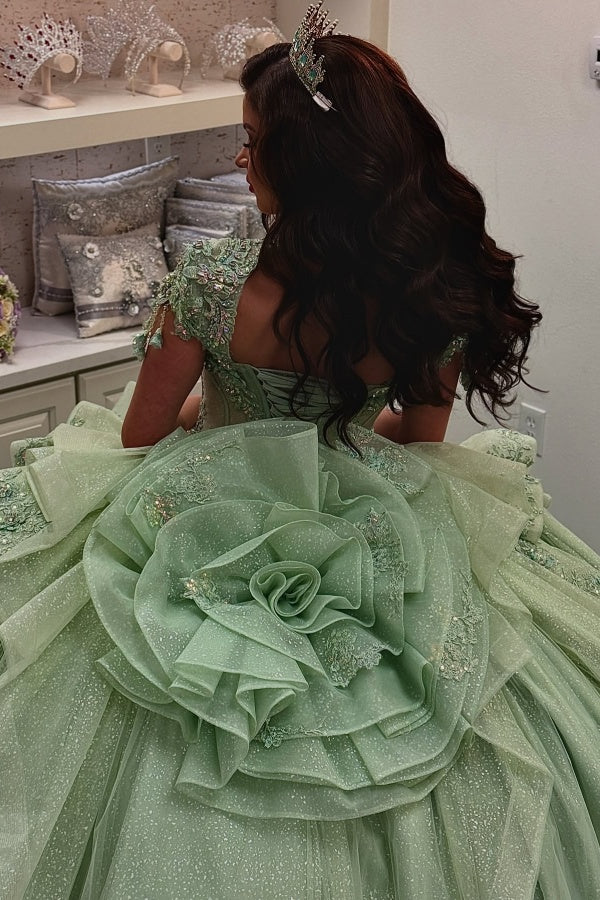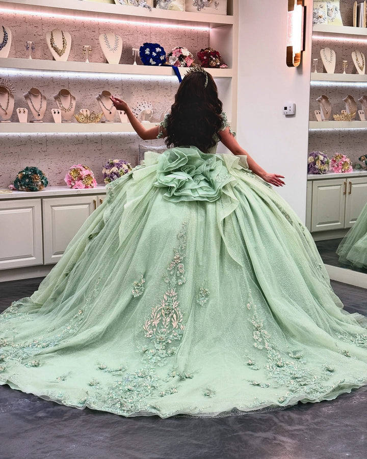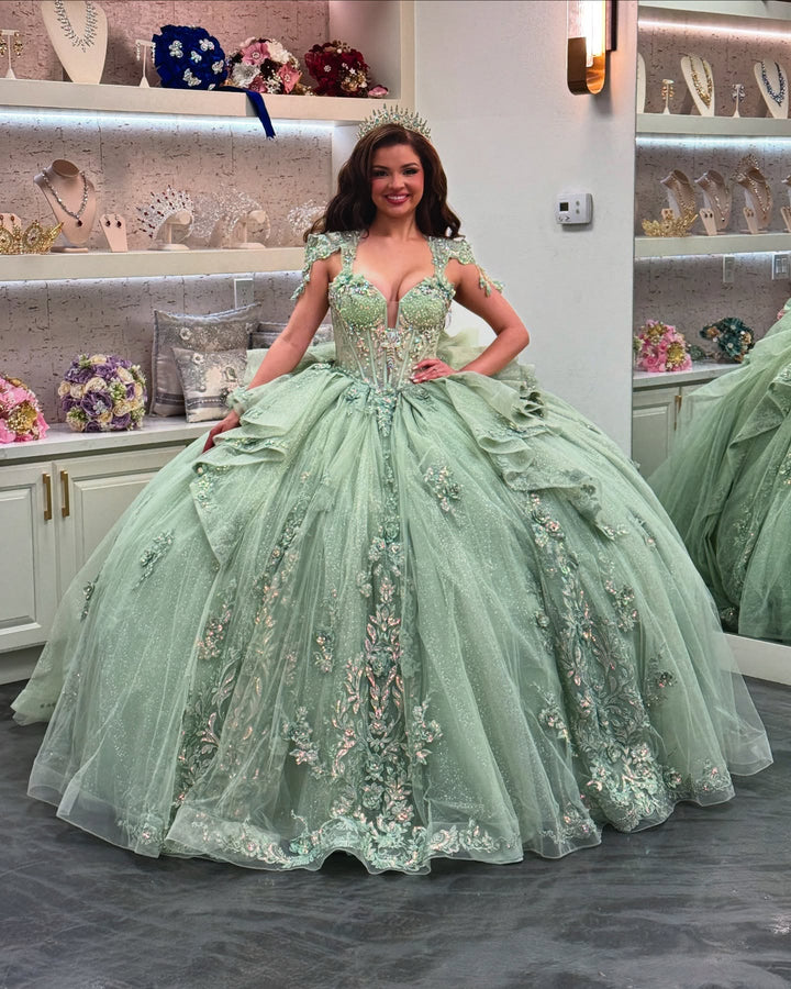 • Merkmale des Quinceanera-Kleides: Langes Ballkleid mit Blumenapplikationen und trägerlosem Korsett, verziert mit metallischen Stickereien und Kristallperlen; der volle Glitzertüllrock wurde passend dazu akzentuiert und verfügt über eine geformte Überlage und eine Kathedralenschleppe.