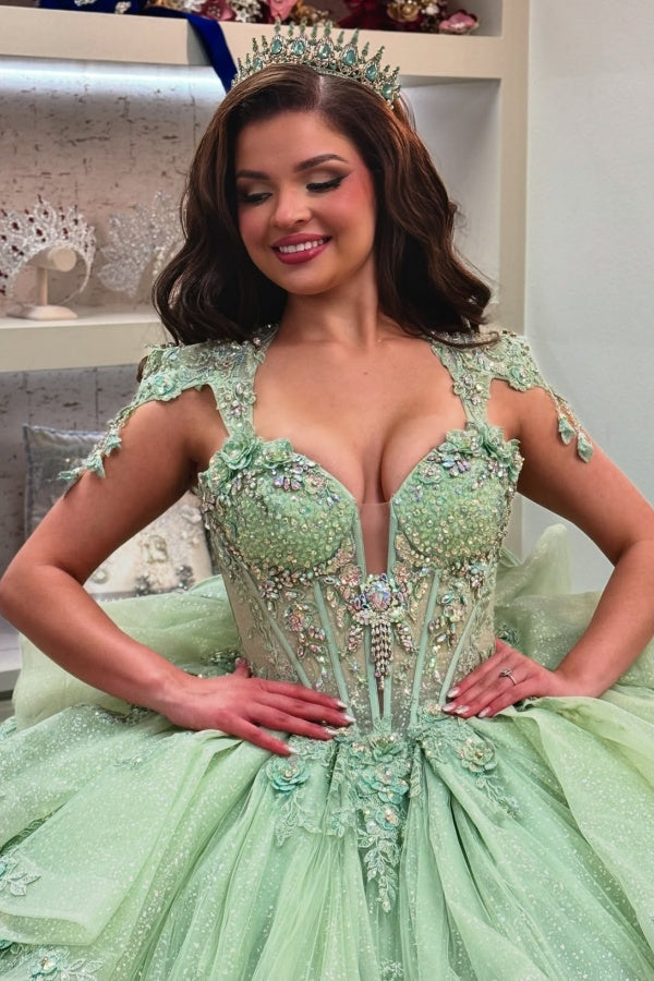 Langes Quinceanera-Kleid mit Herzausschnitt für Damen, trägerloses Korsett mit Blumenapplikationen, Perlenbesetztes Tüll-Ballkleid
