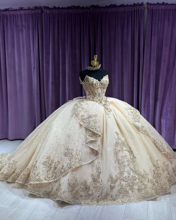 Champagner Quinceanera-Kleider, Herzausschnitt, Korsett, Ballkleid, Spaghettiträger, Spitzenapplikationen, funkelnde Perlen, Tüll, abgestufte Rüschen, Sweet 16-Kleid