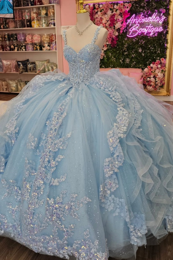 Langes Quinceanera-Kleid mit Herzausschnitt für Damen, trägerloses Korsett mit Blumenapplikationen, Perlenbesetztes Tüll-Ballkleid