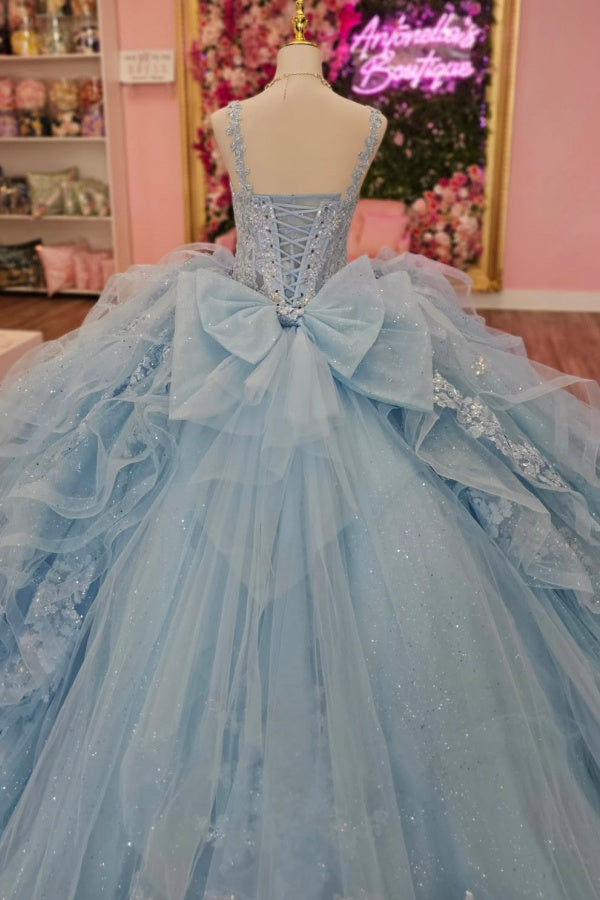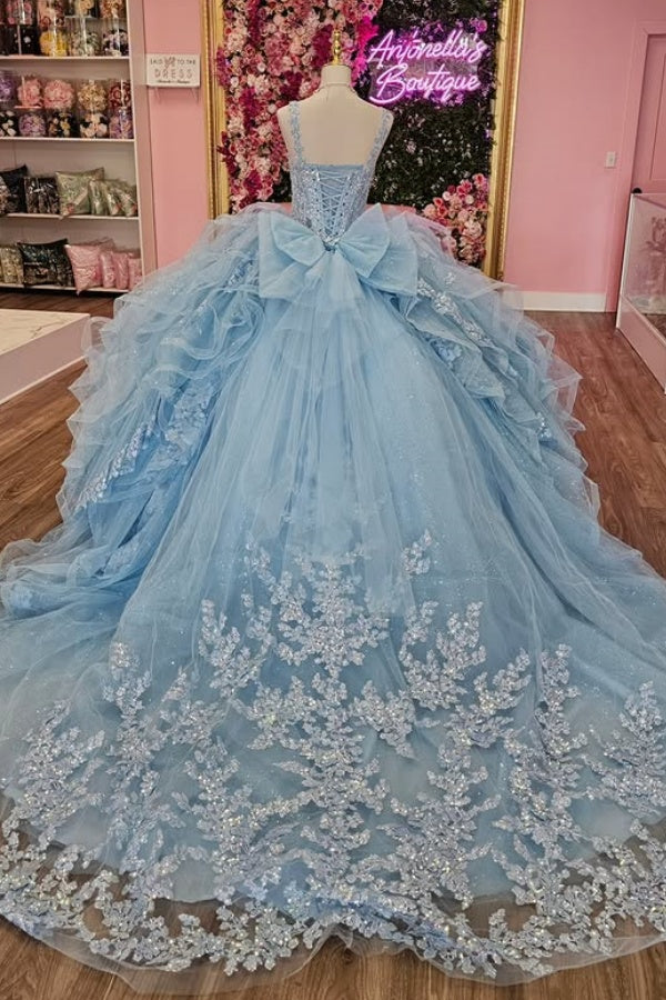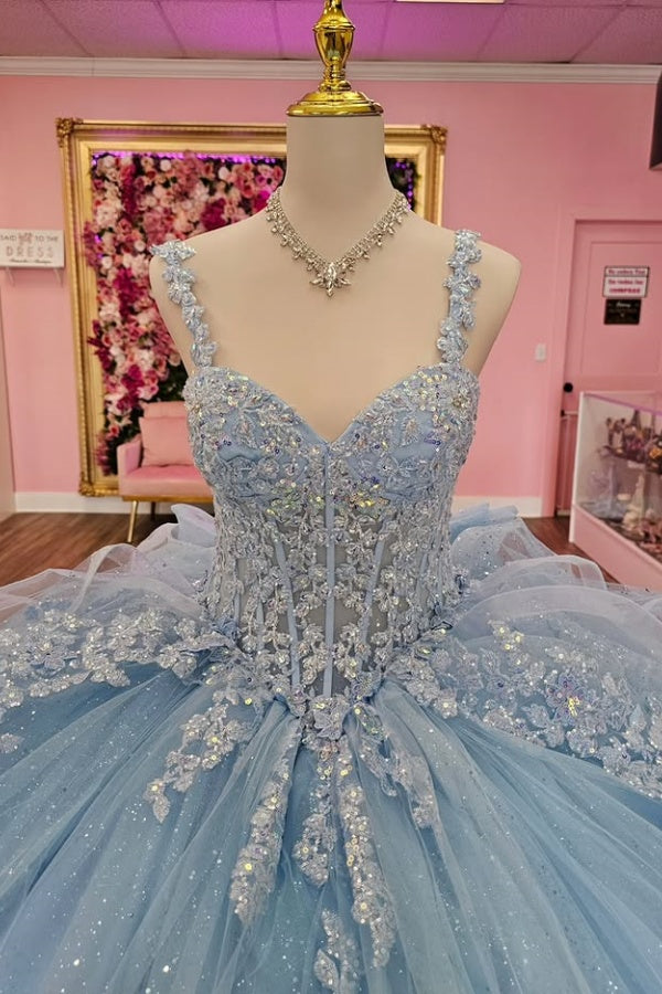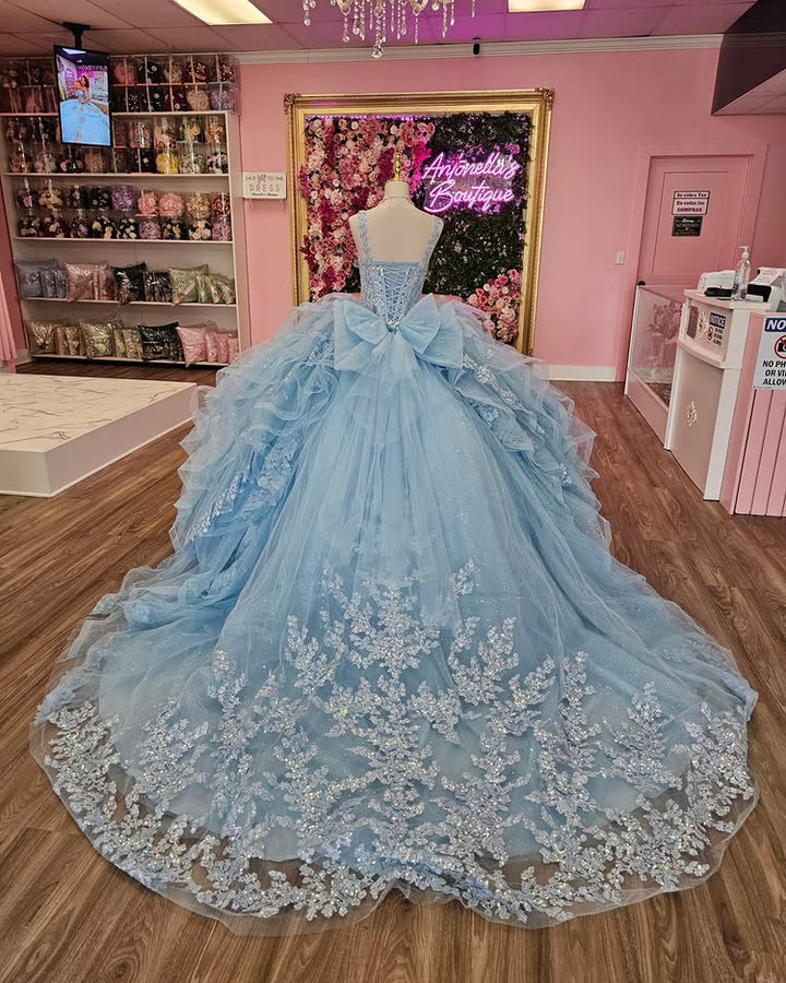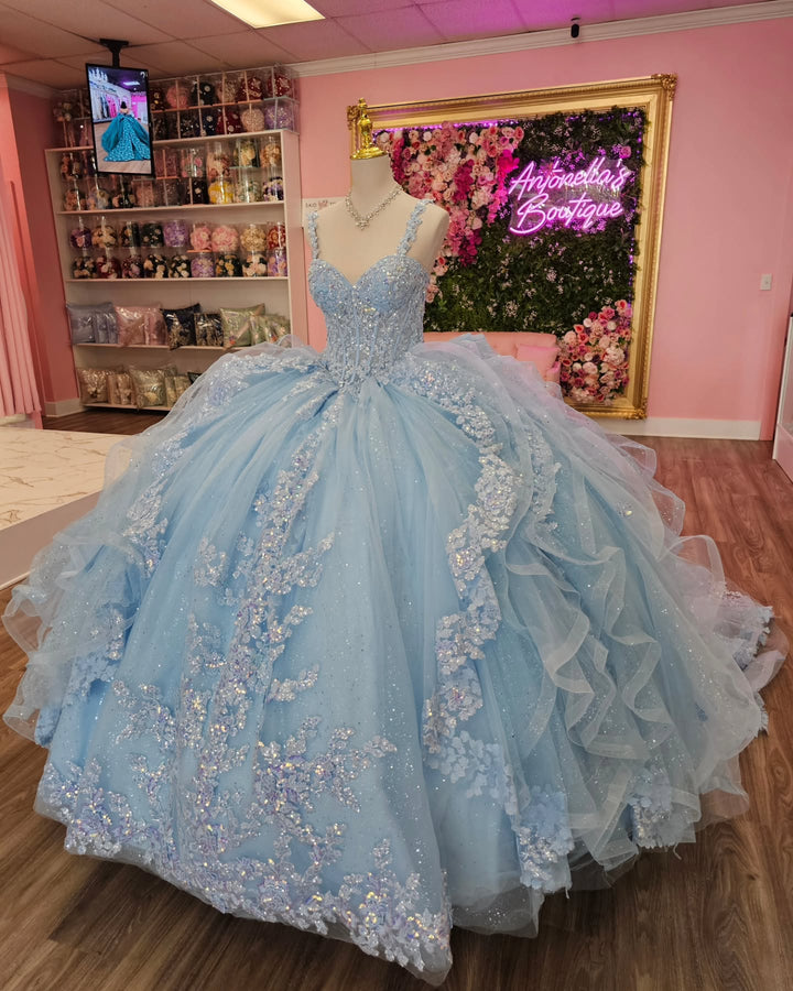 • Merkmale des Quinceanera-Kleides: Langes Ballkleid mit Blumenapplikationen und trägerlosem Korsett, verziert mit metallischen Stickereien und Kristallperlen; der volle Glitzertüllrock wurde passend dazu akzentuiert und verfügt über eine geformte Überlage und eine Kathedralenschleppe.