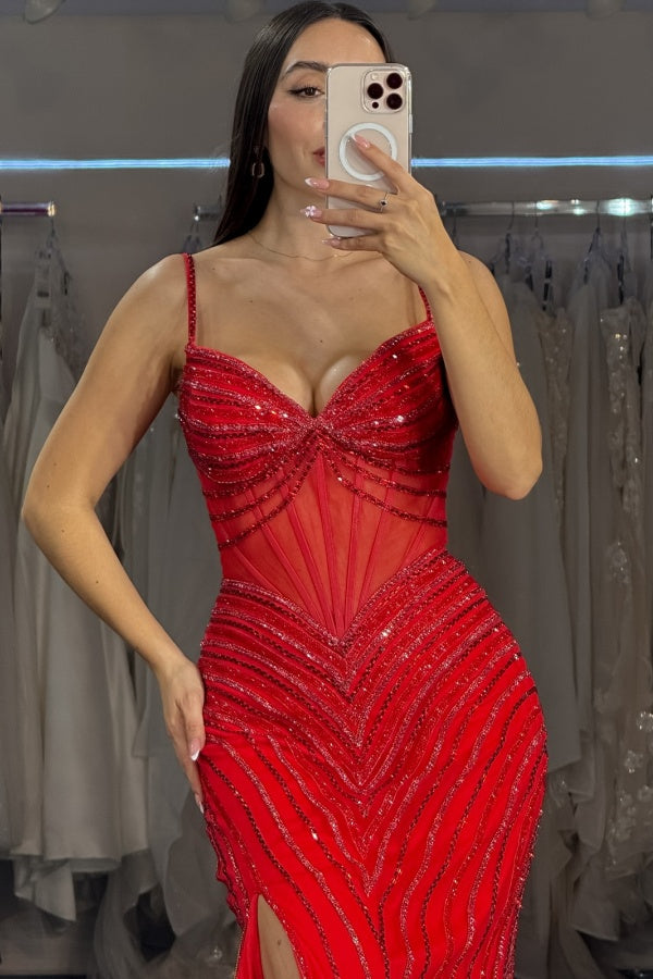 WU1130 - Wunderschönes schulterfreies ärmelloses Ball- und Partykleid mit Pailletten, hohem Seitenschlitz und Schleppe, Abendkleid, Cocktailkleid