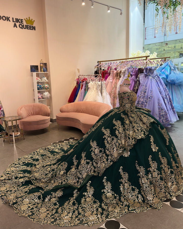 • Merkmale des Quinceanera-Kleides: Langes Ballkleid mit Blumenapplikationen und trägerlosem Korsett, verziert mit metallischen Stickereien und Kristallperlen; der volle Glitzertüllrock wurde passend dazu akzentuiert und verfügt über eine geformte Überlage und eine Kathedralenschleppe.