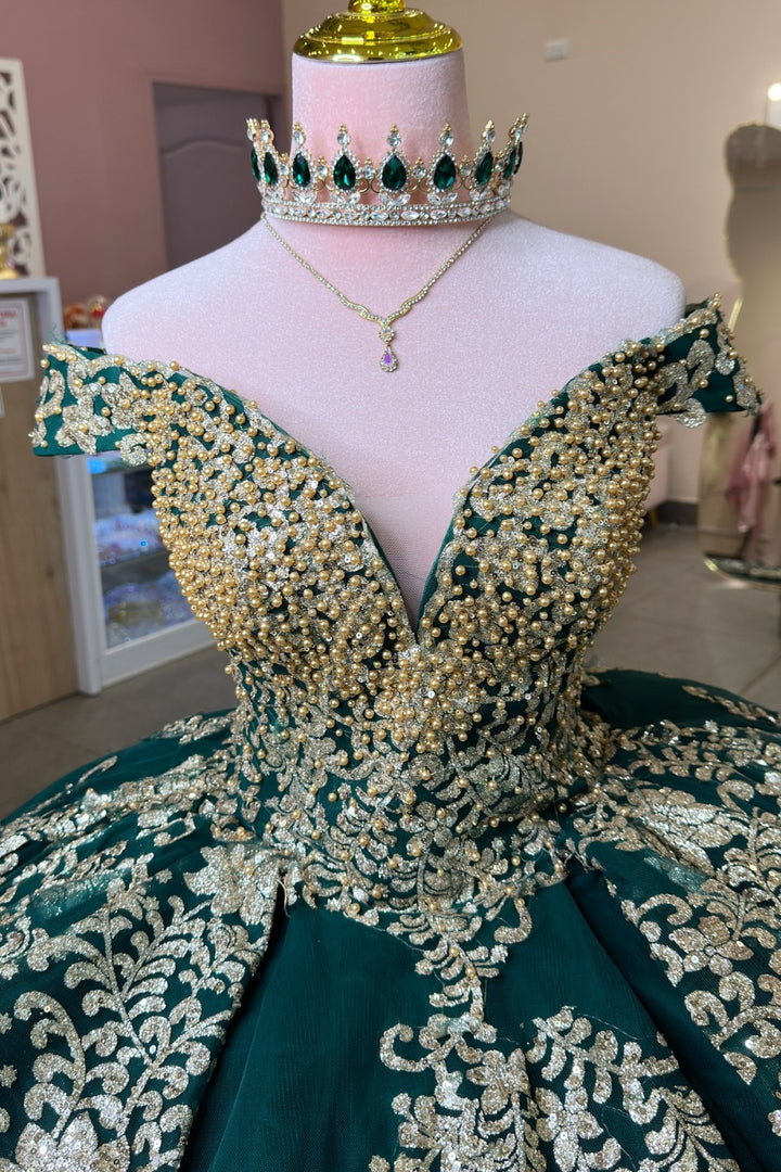 Langes Quinceanera-Kleid mit Herzausschnitt für Damen, trägerloses Korsett mit Blumenapplikationen, Perlenbesetztes Tüll-Ballkleid