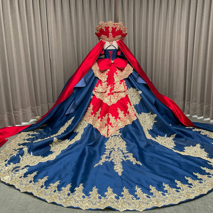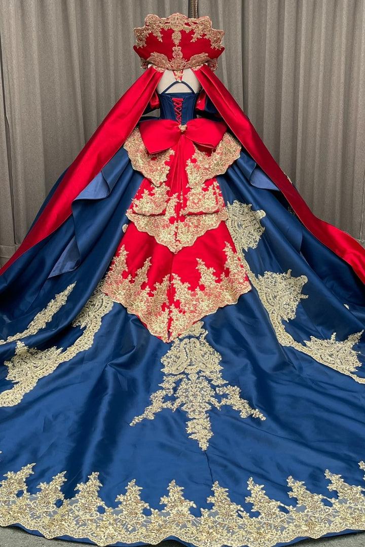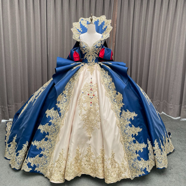 • Merkmale des Quinceanera-Kleides: Langes Ballkleid mit Blumenapplikationen und trägerlosem Korsett, verziert mit metallischen Stickereien und Kristallperlen; der volle Glitzertüllrock wurde passend dazu akzentuiert und verfügt über eine geformte Überlage und eine Kathedralenschleppe.