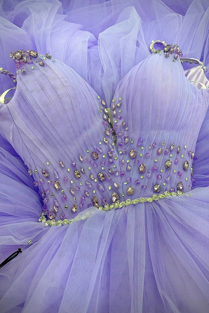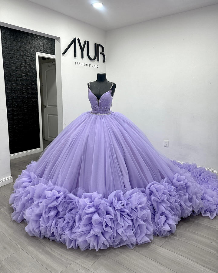 • Merkmale des Quinceanera-Kleides: Langes Ballkleid mit Blumenapplikationen und trägerlosem Korsett, verziert mit metallischen Stickereien und Kristallperlen; der volle Glitzertüllrock wurde passend dazu akzentuiert und verfügt über eine geformte Überlage und eine Kathedralenschleppe.