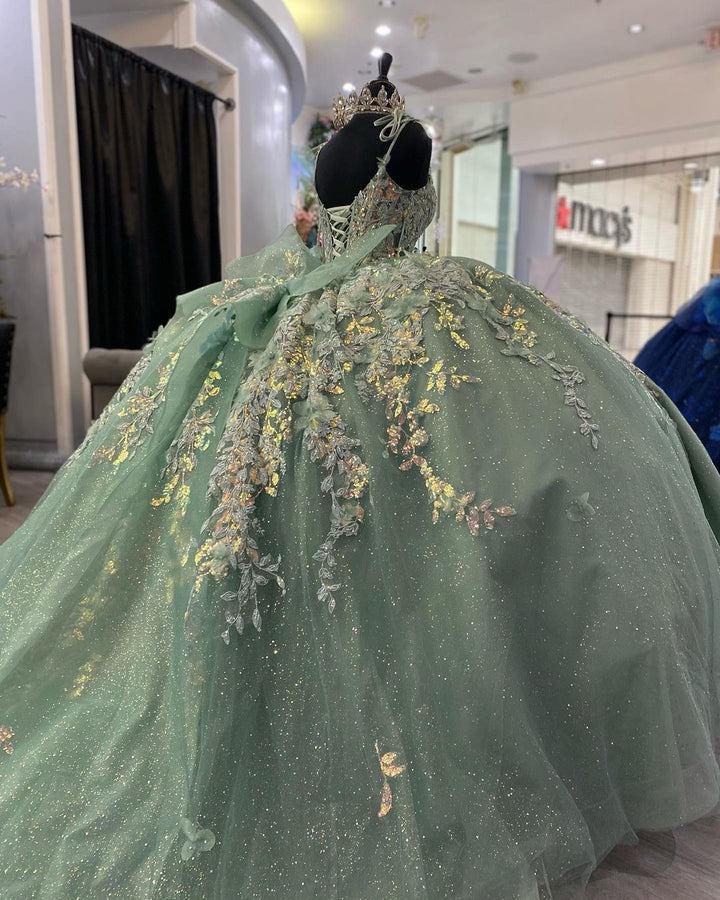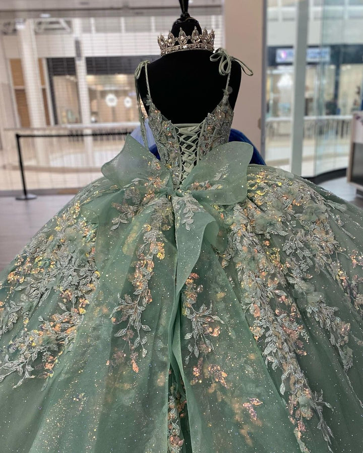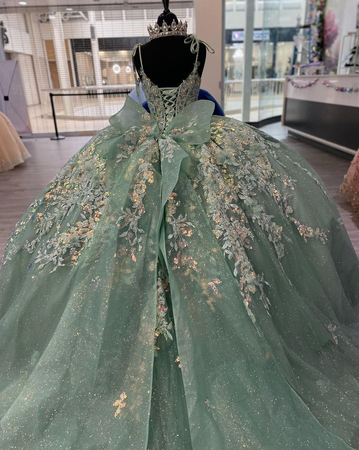Mintgrüne Spitzenapplikationen mit Perlen besetztem V-Ausschnitt und Spaghettiträgern Prinzessin Quinceanera Kleider 2024 Funkelnde Tüllschleife Schnürkorsett Ballkleider Langes Ballkleid