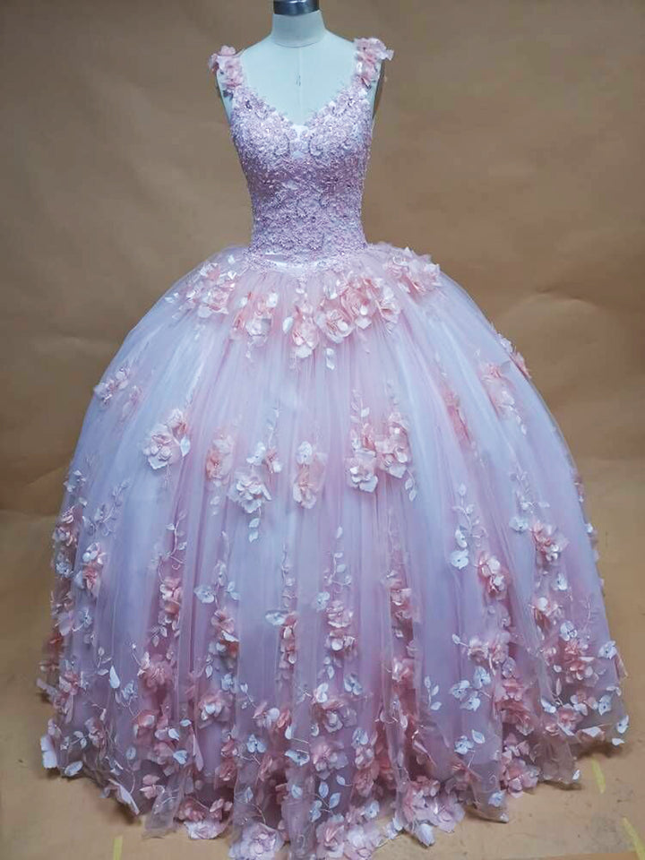 Rosa Prinzessin Quinceanera Kleider Ballkleid V-Ausschnitt Blumenspitze Applikationen Perlen Tüll Puffy Sweet 16 Kleid Abschlussball Partykleider