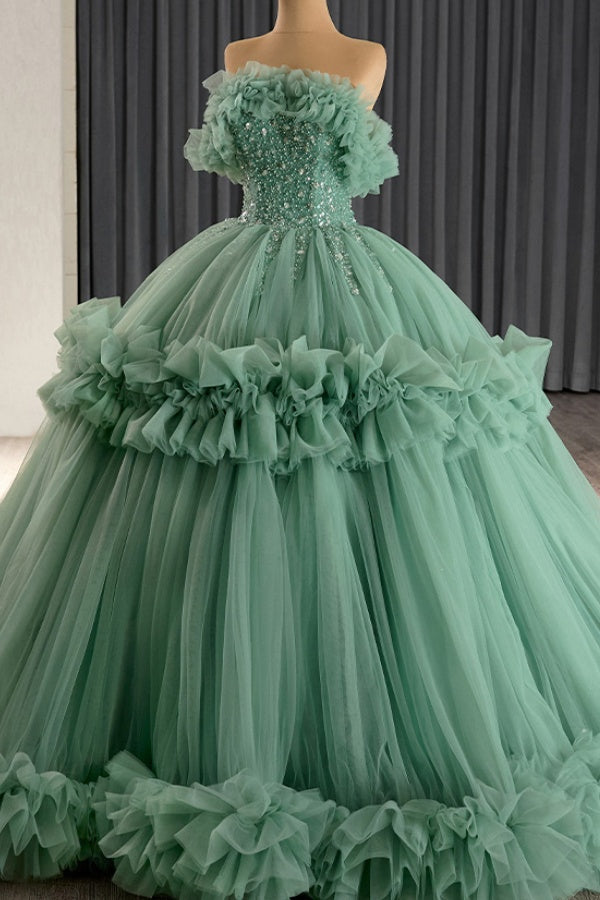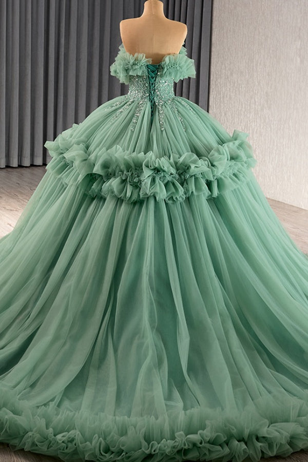 Langes Quinceanera-Kleid mit Herzausschnitt für Damen, trägerloses Korsett mit Blumenapplikationen, Perlenbesetztes Tüll-Ballkleid