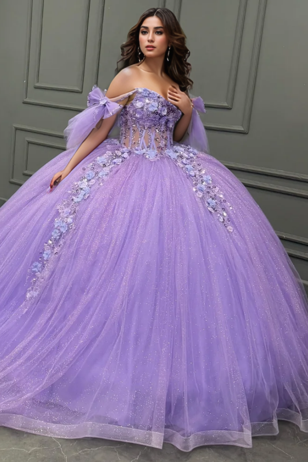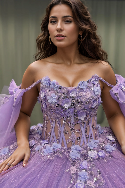 Langes Quinceanera-Kleid mit Herzausschnitt für Damen, trägerloses Korsett mit Blumenapplikationen, Perlenbesetztes Tüll-Ballkleid