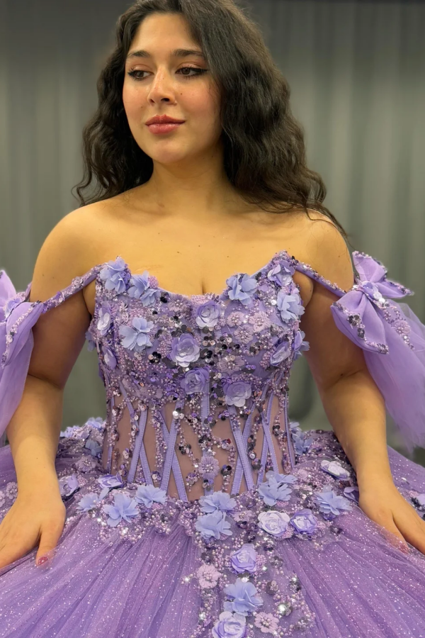 • Merkmale des Quinceanera-Kleides: Langes Ballkleid mit Blumenapplikationen und trägerlosem Korsett, verziert mit metallischen Stickereien und Kristallperlen; der volle Glitzertüllrock wurde passend dazu akzentuiert und verfügt über eine geformte Überlage und eine Kathedralenschleppe.