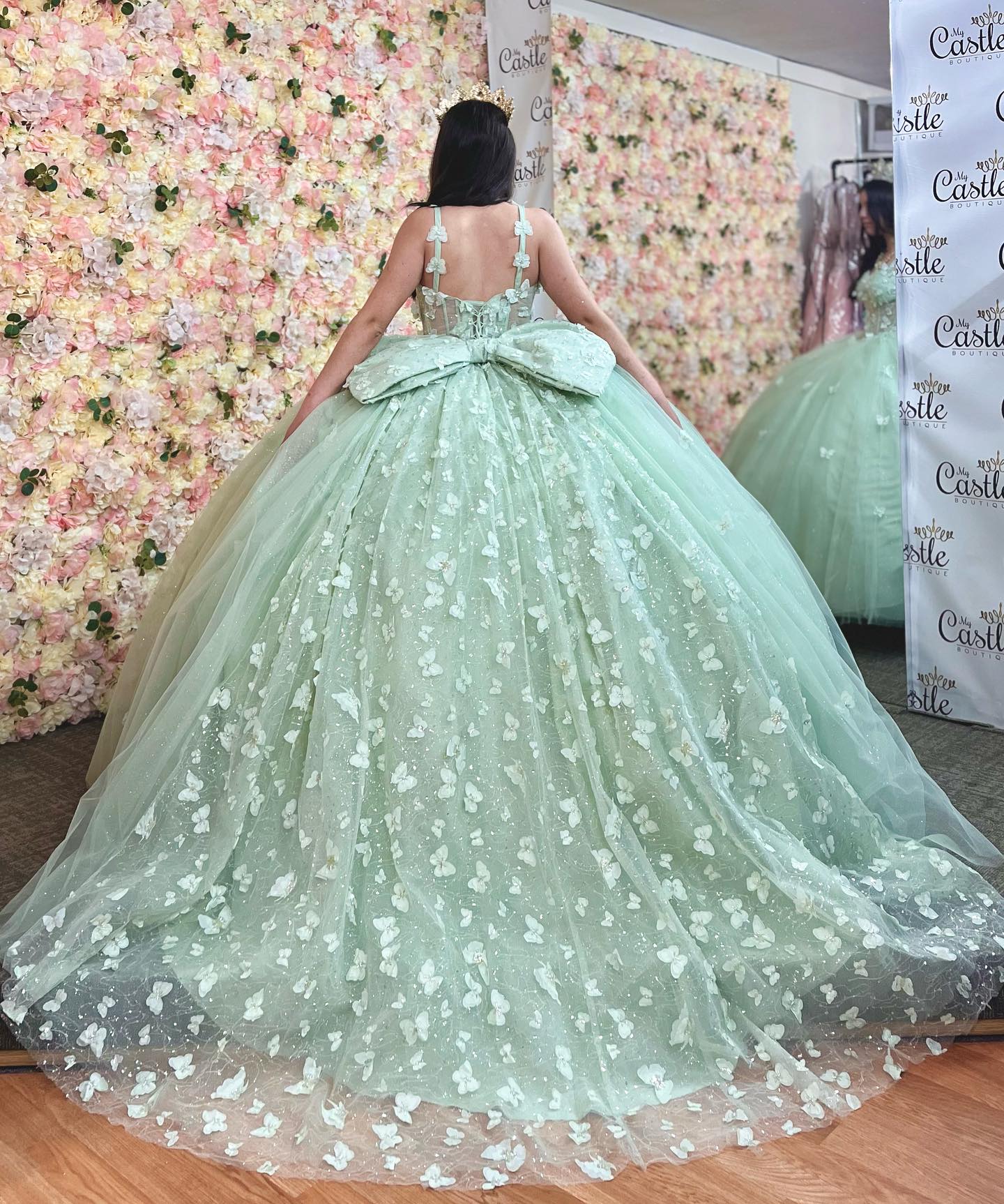 • Merkmale des Quinceanera-Kleides: Langes Ballkleid mit Blumenapplikationen und trägerlosem Korsett, verziert mit metallischen Stickereien und Kristallperlen; der volle Glitzertüllrock wurde passend dazu akzentuiert und verfügt über eine geformte Überlage und eine Kathedralenschleppe.