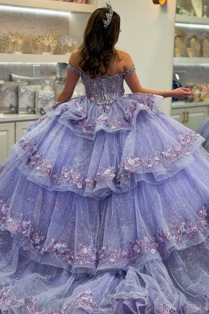 • Merkmale des Quinceanera-Kleides: Langes Ballkleid mit Blumenapplikationen und trägerlosem Korsett, verziert mit metallischen Stickereien und Kristallperlen; der volle Glitzertüllrock wurde passend dazu akzentuiert und verfügt über eine geformte Überlage und eine Kathedralenschleppe.