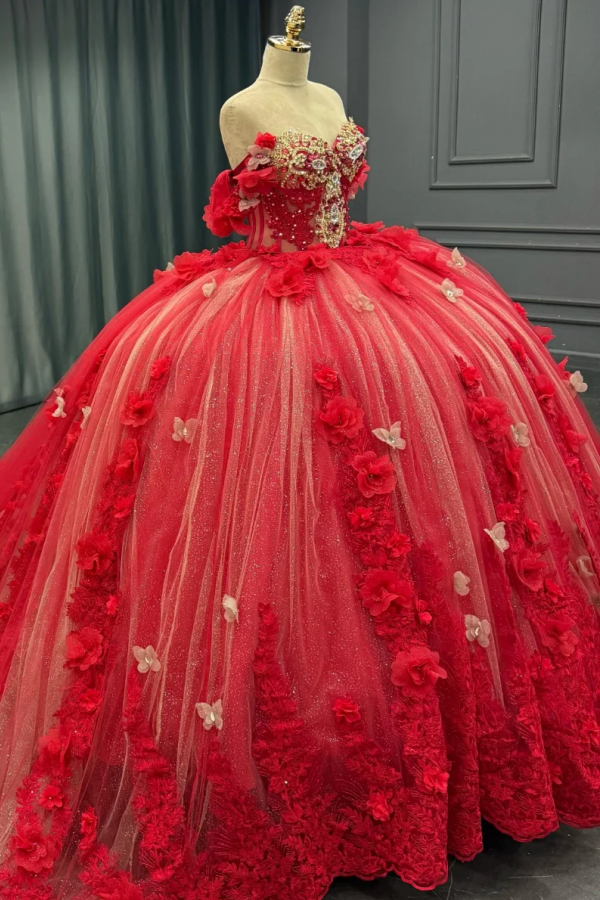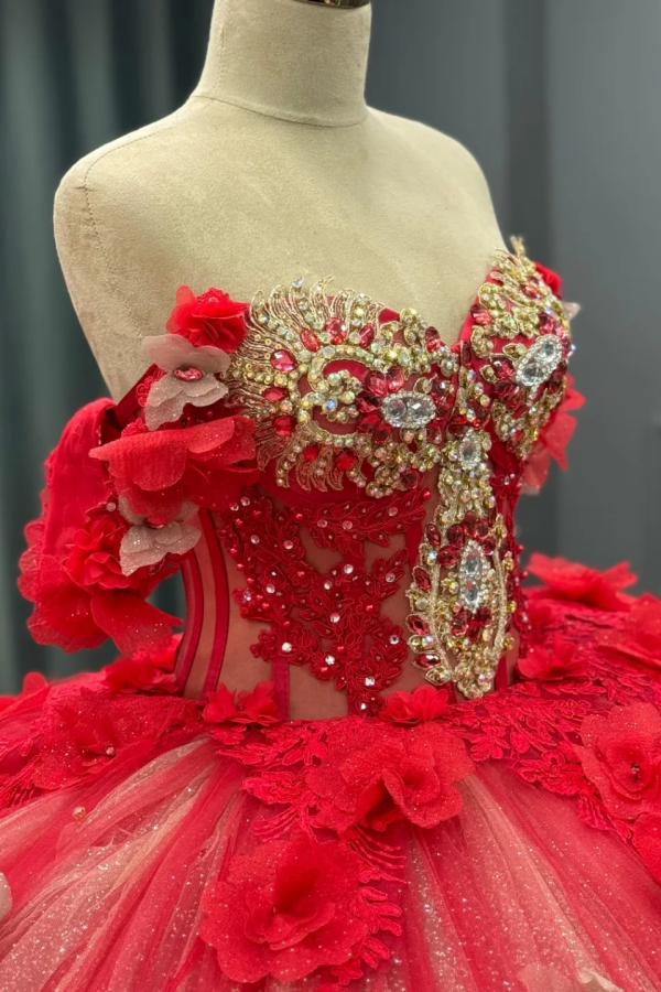• Merkmale des Quinceanera-Kleides: Langes Ballkleid mit Blumenapplikationen und trägerlosem Korsett, verziert mit metallischen Stickereien und Kristallperlen; der volle Glitzertüllrock wurde passend dazu akzentuiert und verfügt über eine geformte Überlage und eine Kathedralenschleppe.