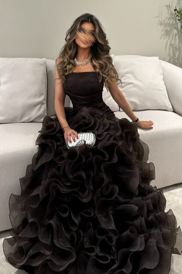 WU1087 - Schickes und modernes Meerjungfrauen-Kleid, trägerlos, ärmellos, Tüll, gestuftes Ball- und Partykleid, schwarz, bodenlang, formelles Abendkleid, Cocktailkleid