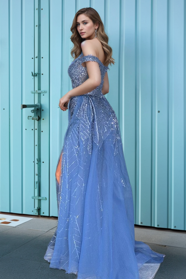 WU1130 - Wunderschönes schulterfreies ärmelloses Ball- und Partykleid mit Pailletten, hohem Seitenschlitz und Schleppe, Abendkleid, Cocktailkleid