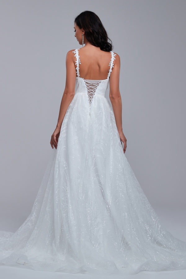 WW1007 - Glamouröses und glitzerndes A-Linien-Brautkleid mit tiefem V-Ausschnitt, Spaghettiträgern, Applikationen, Tüll, Schnürung, bodenlanges Brautkleid