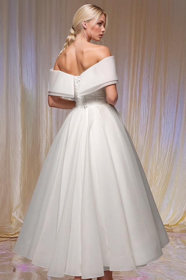 WW1010 - Elegantes und hinreißendes A-Linien-Brautkleid aus schulterfreiem, ärmellosem, plissiertem Satin mit hohem Seitenschlitz und Hofschleppe