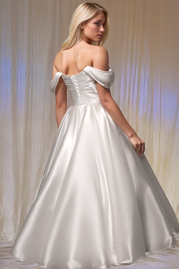 WW1010 - Elegantes und hinreißendes A-Linien-Brautkleid aus schulterfreiem, ärmellosem, plissiertem Satin mit hohem Seitenschlitz und Hofschleppe