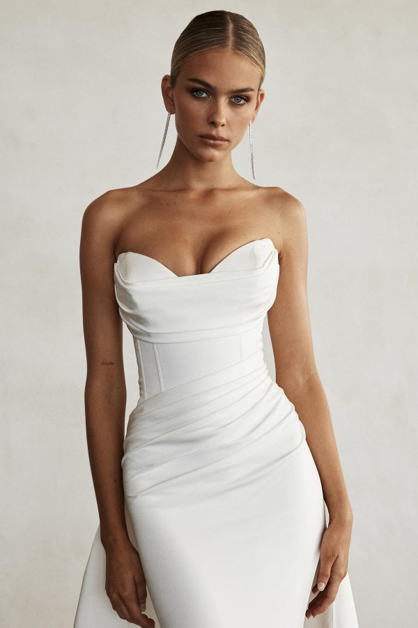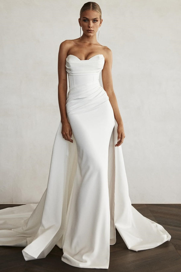 WW1010 - Elegantes und hinreißendes A-Linien-Brautkleid aus schulterfreiem, ärmellosem, plissiertem Satin mit hohem Seitenschlitz und Hofschleppe