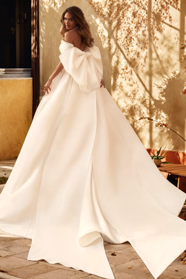 WW1010 - Elegante y magnífico vestido de novia de satén plisado sin mangas con hombros descubiertos y corte A, con abertura lateral alta y cola de corte con lazo en el cuello.