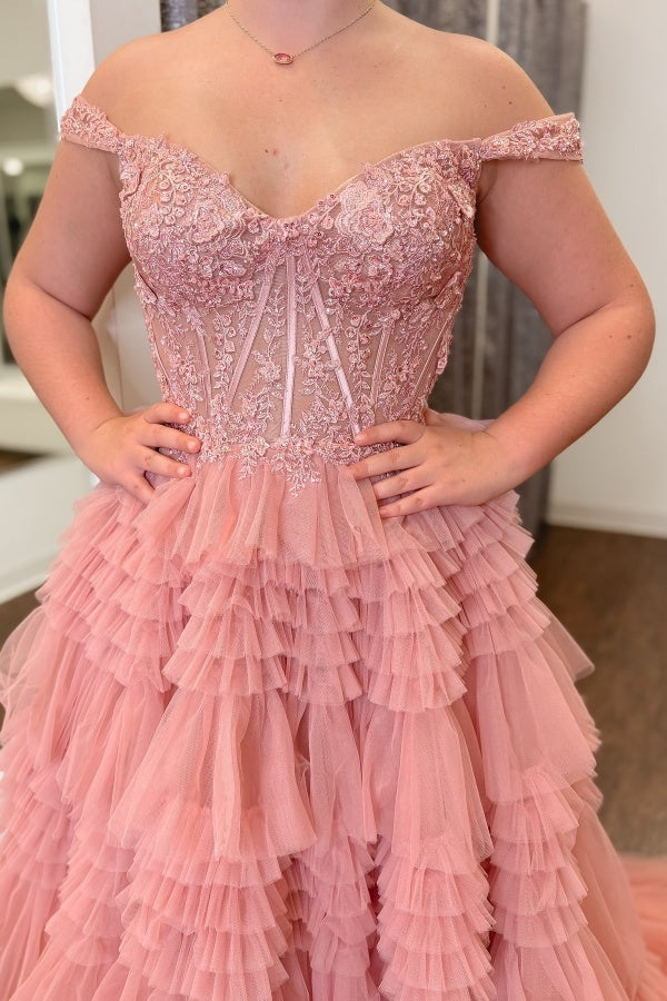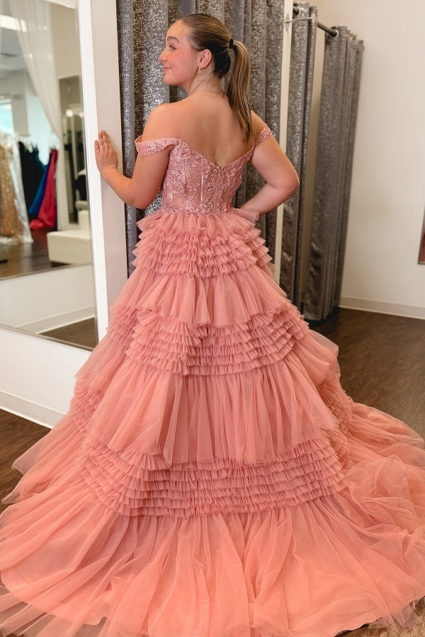 WU1240 - Vestido de fiesta formal de noche, sencillo e informal, de corte A, sin mangas, con hombros descubiertos, de tul y apliques escalonados.