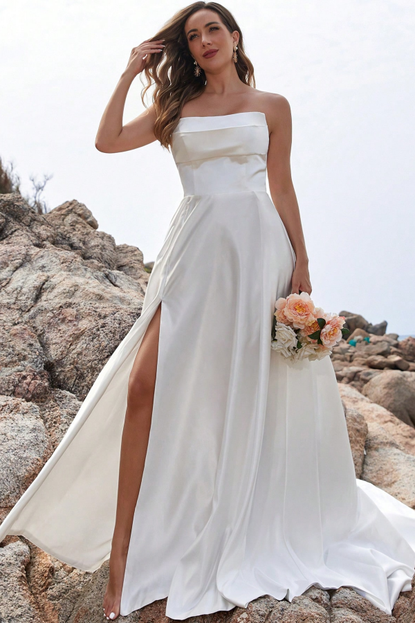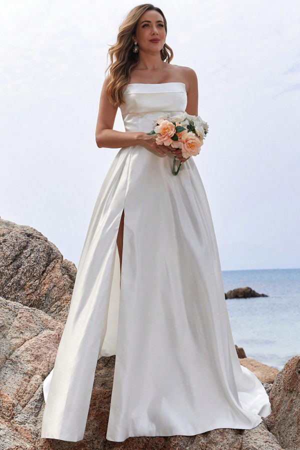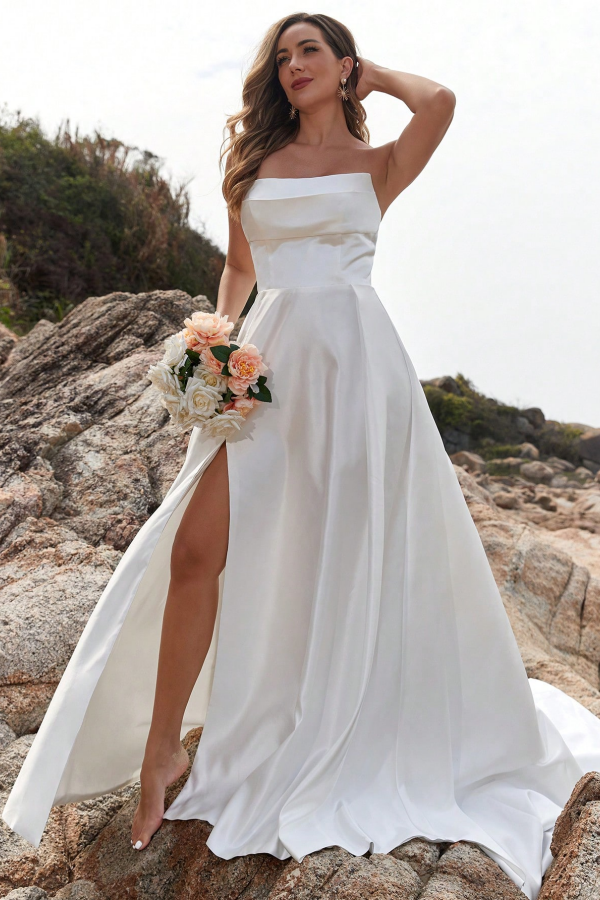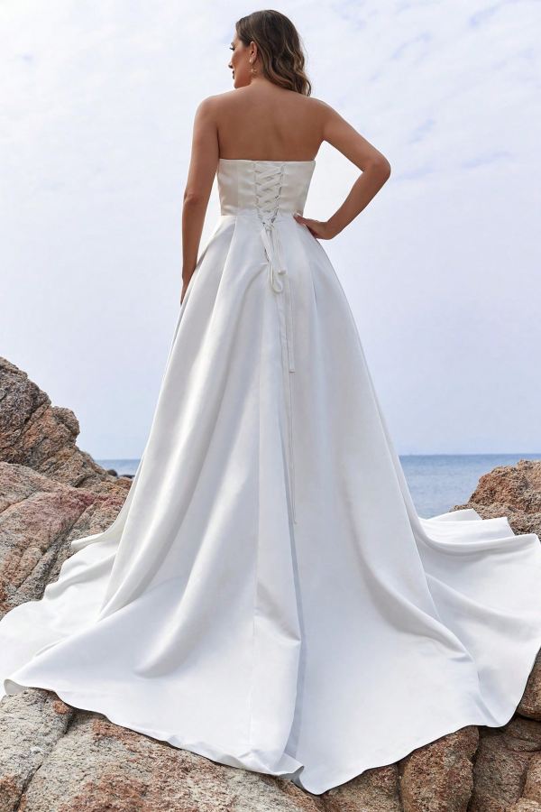 WW1047 - Vestido de novia de satén con corte A, sin mangas, plisado, con abertura lateral alta y cola, con cordones, para playa