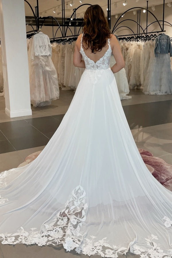 WW1055 - Vestido de novia de gasa con escote en V, tirantes finos, sin mangas, apliques, cremallera en la espalda y cola.