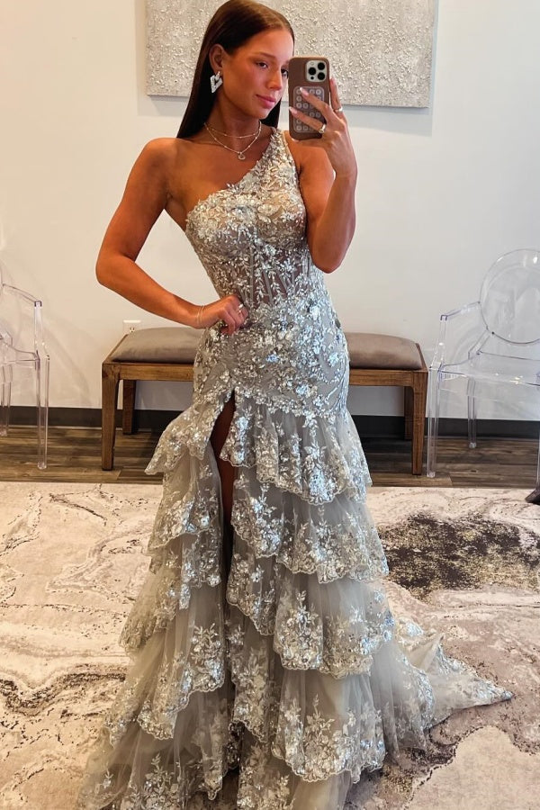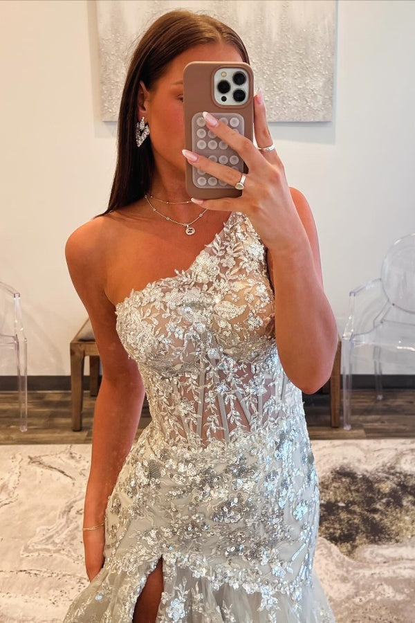WU1319 - Hermoso vestido de fiesta de sirena con un hombro al descubierto, sin mangas, con lentejuelas, apliques de encaje, espalda abierta, abertura lateral alta y cola.