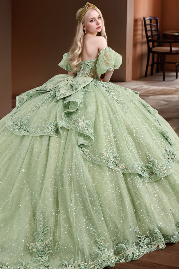 Descripción: Presentamos el WQ1278: la combinación perfecta de estilo chic y moderno. Este vestido de gala presenta un diseño de hombros descubiertos y medias mangas farol, adornado con apliques florales 3D y volantes. El tul verde escalonado le da un toque de elegancia, perfecto para fiestas de cumpleaños con cola o quinceañeras. No te conformes con lo común, destaca con esta impresionante pieza.