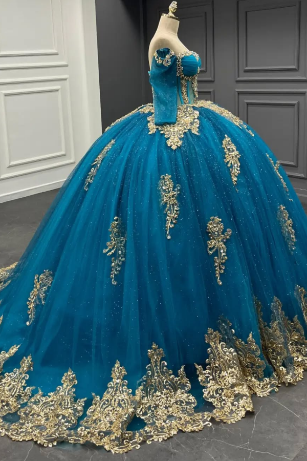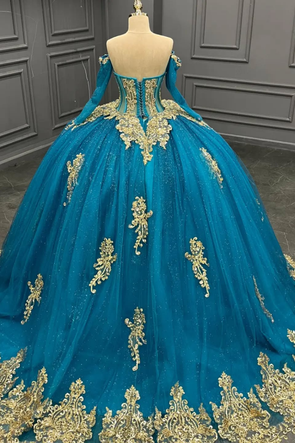 WQ1311 - Vestido de quinceañera de tul azul lago con hombros descubiertos, mangas largas, apliques dorados 3D y cuentas, vestido de fiesta de cumpleaños para dulces 16
